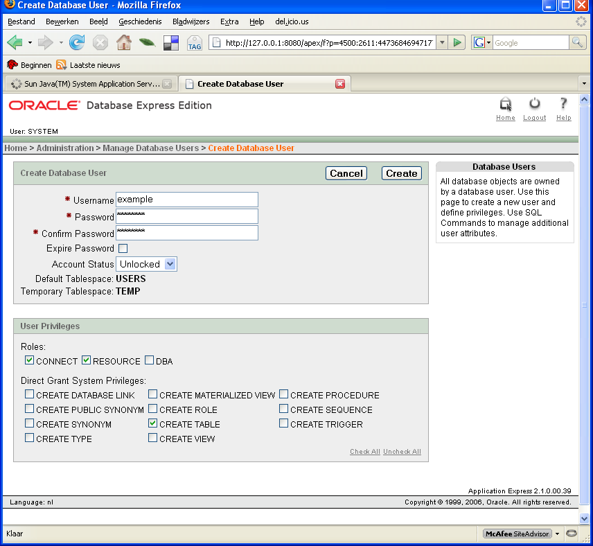 application server. In order for the modified ant build.xml files to function the environment variable APPSERV_HOME must be set to the location where the the application server is installed. Create the database userOn the databas side create an user that will be used to connect from the application server to the database. Login with the system account, select the button Administration and then the button Database Users. Press the create button and give an username and password (remember the username and password as these are needed when the connection details are filled in in the application server later on. Also select the create table privilege ![]() Adding the oracle connection poolStart the application server and create a new connection pool, give it a name and select the database vendor used (Oracle). ![]() In the next screen leave all defaults and enter the following information in the properties: